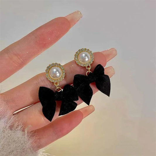 Vintage Black Bowknot Stud Earrings with Drop Heart Pearl