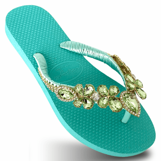 AdDRESSingMe™ Luxurious Light Green Flip Flops With Rhinestones – Fresh, Soft & Sparkly