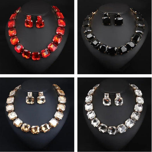 Geometric Crystal Rhinestone Necklace and Earring Set- Red