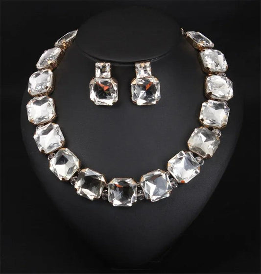 Geometric Crystal Rhinestone Necklace and Earring Set - White