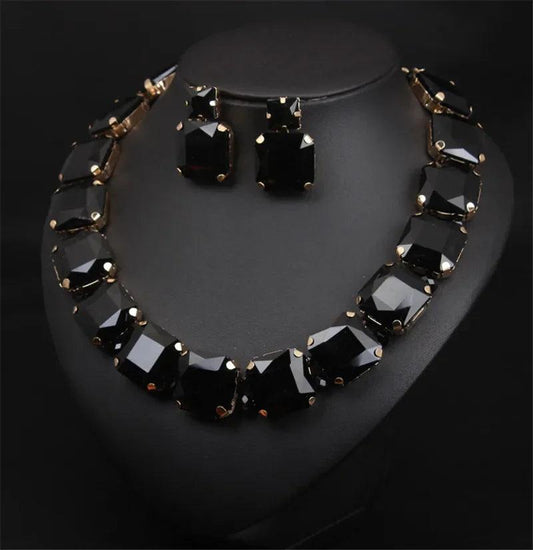 Geometric Crystal Rhinestone Necklace and Earring Set- Black
